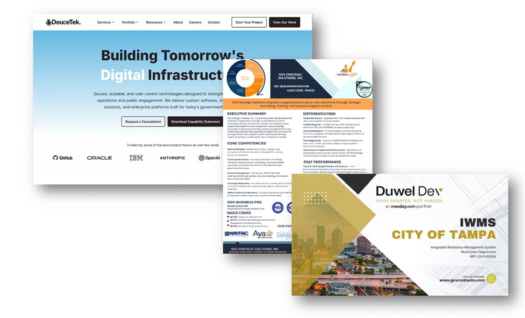 Our work blends strategic capture, executive-level business development, disciplined proposal operations, and data-driven market intelligence. The result is a mature federal engine that improves positioning, strengthens competitiveness, and accelerates contract growth.
